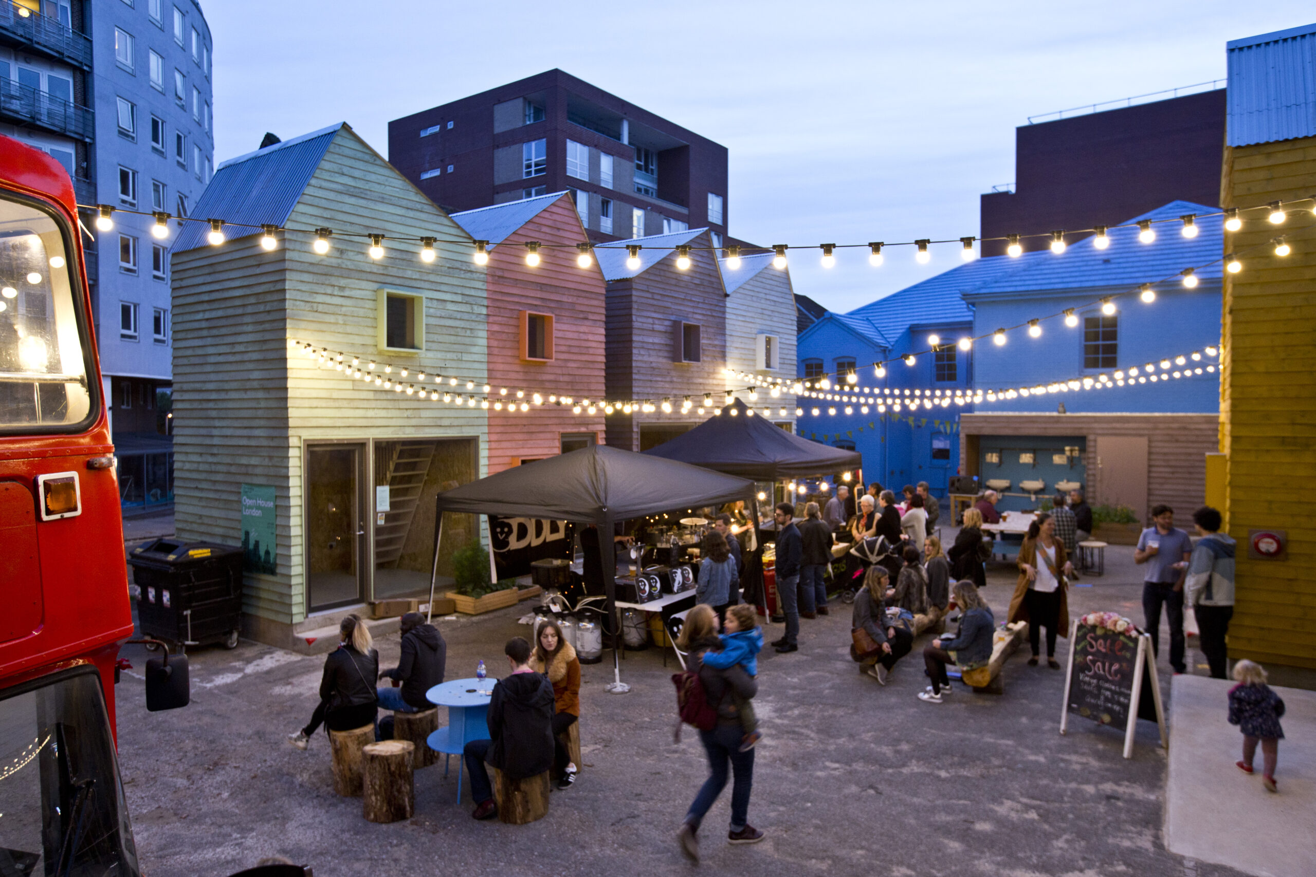 An eye for look and feel is also imperative to creating outcomes. Be it a relaxed festival atmosphere intended to spark conversations such as at Caravanserai, or at the other end of the spectrum, the apparent permanence of Place Ladywell that has created 24 homes for people to live in, despite the site only being available for 1 to 4 years. Architects and designers, with their strong knowledge of aesthetics and spatiality can curate somewhere that feels appropriate and prompts action and interactions in ways that are meaningful for the intended purpose of the site. Take Blue House Yard, which creates cosy mingling space and footfall on a site through space design, lighting and the inclusion of a bus cafe, building the perfect environment to test businesses and new ideas where drawing a crowd is key.