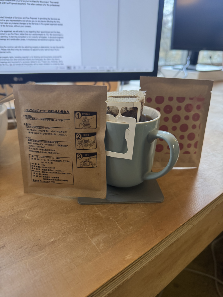 Joyce brought back some lovely coffee from her travels in Japan in October 2025. We’ve been getting through it in the studio, and thought we’d share the innovative design. The coffee is pre-packaged in a bag (similar to a teabag), but open on top. It has two arms which allow you to be able to rest the coffee within your mug and pour hot water into the bag. Almost like a mini-pour over coffee set-up! They’re an innovative use of design & also great coffee.