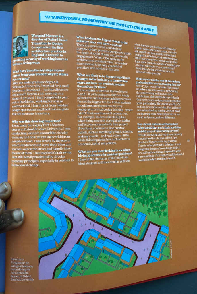 Wongani was interviewed by the Architects Journal about advice for students graduating from architecture. This was all part of the Architect’s Journal’s Student Prize edition, which features students nominated for the AJ Prize across all the architecture schools (one undergraduate student and one postgraduate student nominated per school). In a wonderful crossover, one of Wongani’s former students, Victoria Nistov, is nominated for the undergraduate prize. Wongani teaches an undergraduate unit together with Hannah Durham and Sam Chisholm, called Unit C: Building Stories. You can read the print copy of Wongani’s interview below, or purchase a physical copy here.
